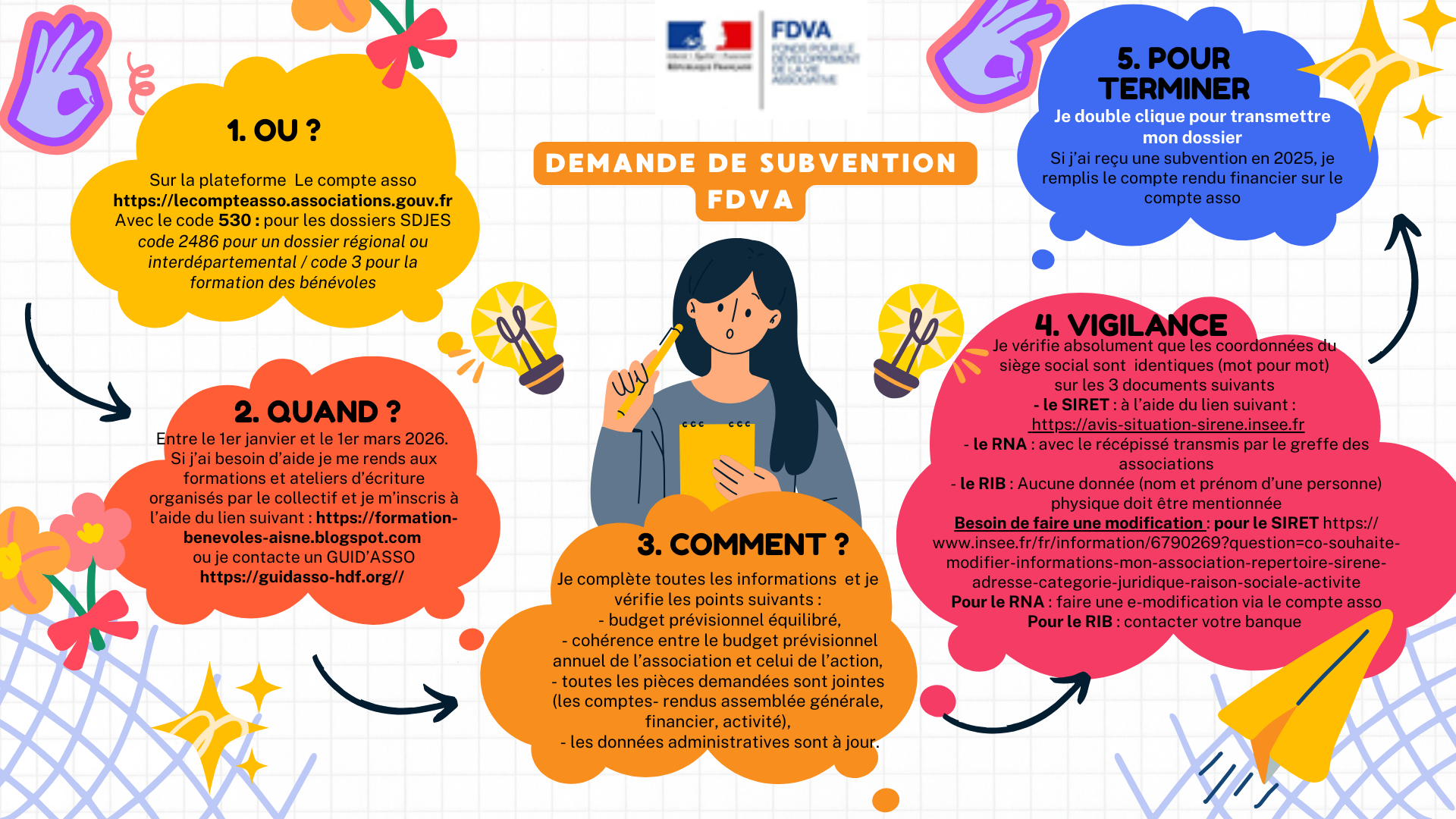 L'Etat contribue au développement de la vie associative par un soutien financier aux associations dans le cadre du FDVA (Fonds pour le développement de la vie associative). Depuis 2018, Il comporte un nouveau volet pour soutenir le fonctionnement et la mise en oeuvre de projets innovants. L'Etat contribue au développement de la vie associative par un soutien financier aux associations dans le cadre du FDVA (Fonds pour le développement de la vie associative). Depuis 2018, Il comporte un nouveau volet pour soutenir le fonctionnement et la mise en oeuvre de projets innovants. L'appel à manifestation d'intérêt (AMI) expose les priorités départementales pour ce qui concerne le soutien au fonctionnement et aux actions innovantes des associations. Tous les secteurs associatifs sont concernés (y compris le sport). Les petites associations (non employeuses ou employant deux salariés au plus) sont une cible privilégiée de ce volet du FDVA. Depuis 2022, une nouvelle condition d'éligibilité avec l'obligation de souscription au contrat d'engagement républicain en vertu des dispositions adoptées le 24 août 2021 en application de la loi confortant le respect des principes de la République. Les aides sont attribuées sur décision du préfet de région après avis des collèges départementaux rapportés à la commission régionale. Les projets et les demandes dépassant la compétence territoriale du collège départemental (projets interdépartementaux ou régionaux) seront soumis pour avis à la commission régionale du FDVA. L'appel à manifestation d'intérêt précise les modalités d'octroi des aides pour l'année 2026 : associations et projets éligibles, les priorités, les modalités financières et de dépôt des dossiers de demande de subvention. >> Téléchargez l'Appel à Manifestation d'Intérêt (AMI) départemental du Fonds pour le développement de la vie associative - FDVA 2026 «Fonctionnement et actions innovantes» >> Téléchargez la synthèse de l'Appel à Manifestation d'Intérêt (AMI) >> Téléchargez la carte mentale de l'AMI 2026 du 2 janvier 2026 au 1er mars 2026 inclus sur la plateforme "Le Compte Asso". Les dossiers envoyés après la date du 1er mars 2026 ne seront pas étudiés. PROCEDURE DE DEPOT DES DOSSIERS : • Les dossiers devront impérativement être déposés sur l'application "Le compte asso" à l'adresse suivante : https://lecompteasso.associations.gouv.fr/ • Auparavant, il faut créer et valider le compte association • Rechercher le type de subvention à l'aide des champs de recherche proposés. Sélectionner dans la liste. : Pour l' Aisne, le numéro de subvention à sélectionner est le 530 • Vérifier et compléter les informations administratives de votre association. Participer aux formations gratuites "Atelier d'écriture sur le Compte Asso" et "Préparer une demande de subvention en ligne" Contacter un membre du réseau Guid'Asso Aisne près de chez vous Télécharger la liste des membres Participer aux permanences Guid'Asso près de chez vous Télécharger le calendrier des permanences Guid'Asso |